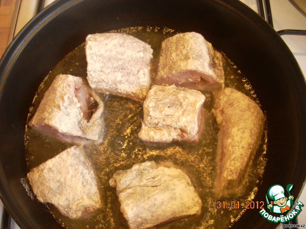 Обваливаем кусочки рыбки в муке и обжариваем на растительном масле на среднем огне примерно по 7-8 минут с каждой стороны.