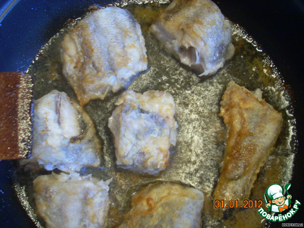 Обычно я покупаю замороженный минтай, но сегодня у меня была лемонема (3 средние тушки). Итак, рыбку мы разморозили, помыли, удалили внутреннюю пленку, отрезали плавники и разрезали ее на порционные кусочки.