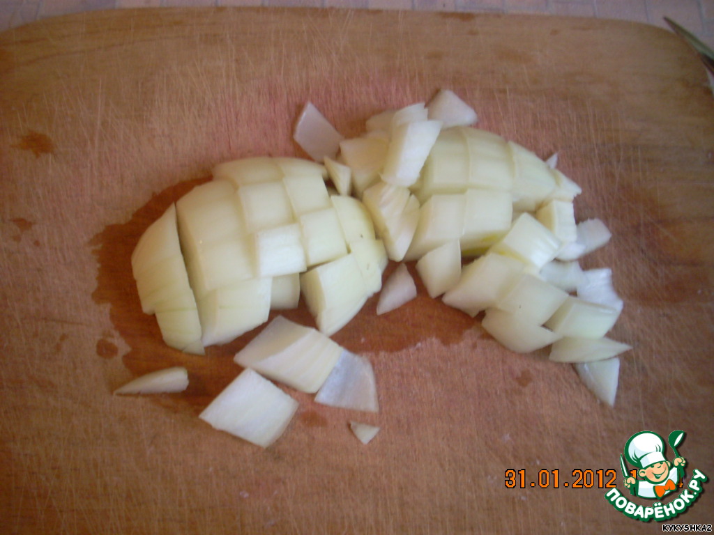 Лук (у меня 2 крупные луковицы) мы режем крупненько. Думаю, на фото это хорошо видно.