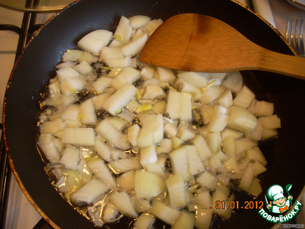 Лук обжариваем на растительном масле до тех пор, пока он не станет мягким и не начнет чуть-чуть золотиться.