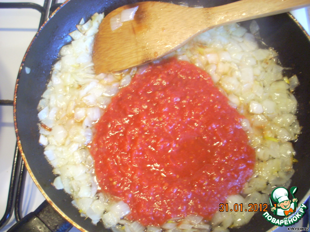 Затем к луку мы добавляем томат (у меня домашний). У меня ушло 7-8 столовых ложек.
