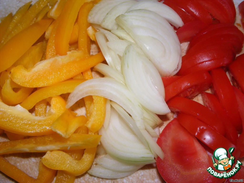 Полукольцами режем перец, лук и помидор.Обжариваем на оливковом масле минут 5.