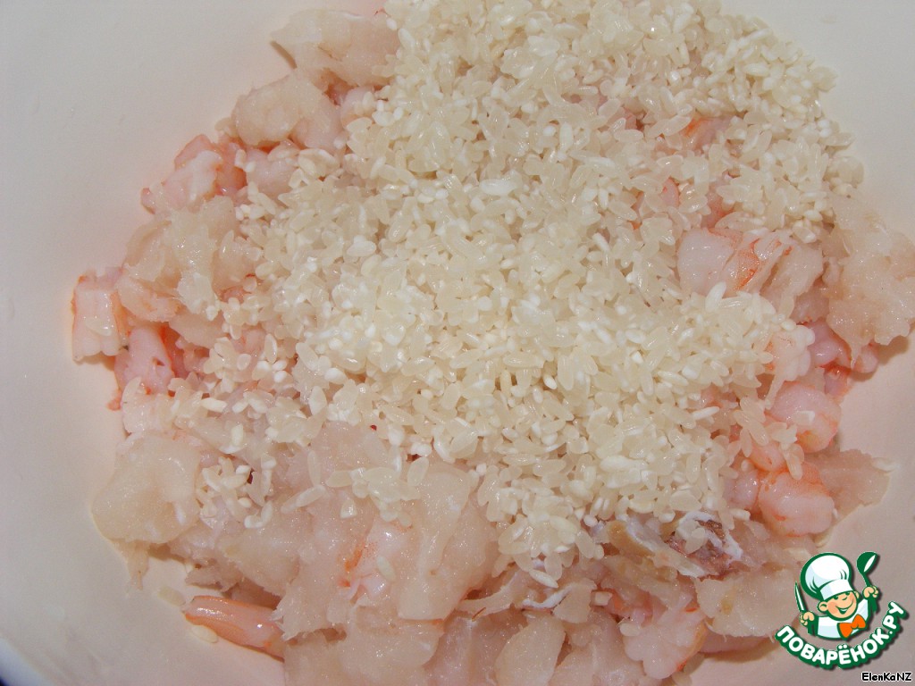 Пока жарятся овощи, из филе рыбы делаем фарш, добавляем мелко порезанные отварные креветки, промытый рис и яйцо.