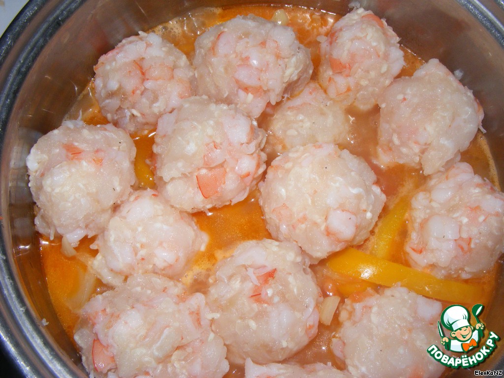 К овощам добавляем рыбный бульон или воду, соль и перец по вкусу. Из фарша формируем колобки и опускаем в закипевший бульон. Варим до мягкости риса.