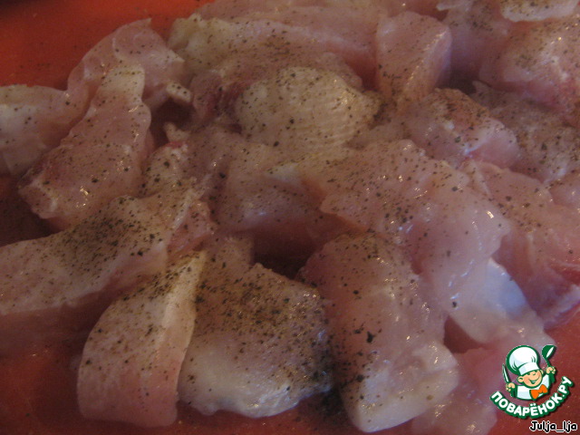 Рыбку нарезаем небольшими кусочками. Солим и перчим по вкусу.