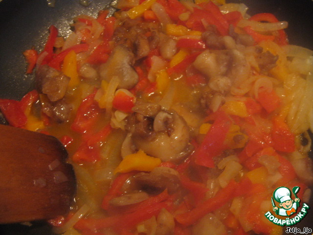 И через 2 минуты шампиньоны. Полностью выпариваем жидкость.