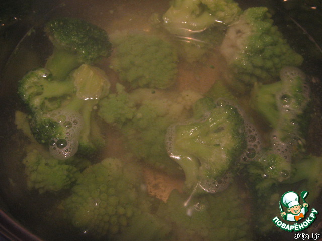Капусту отвариваем до полуготовности в слегка подсоленной и подслащенной кипящей воде. У меня была не только брокколи, но и капуста под загадочным названием, которое я даже не запомнила. Кто знает, если по фото видно саму капусту, напишите. Она от брокколи сильно не отличается по вкусу.