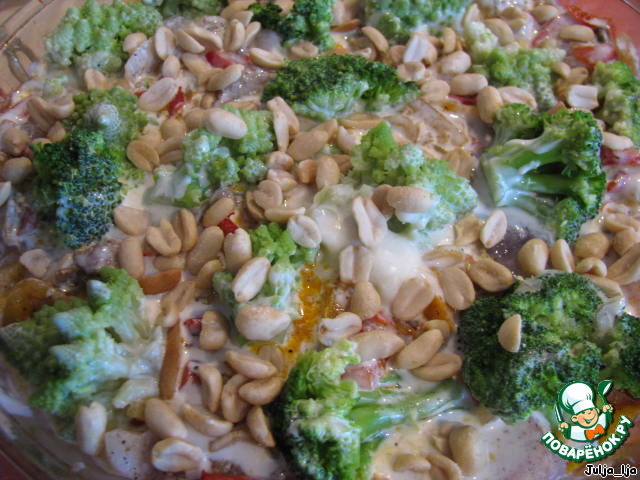 Рыба с овощами и арахисом в сливочно-сырном соусе