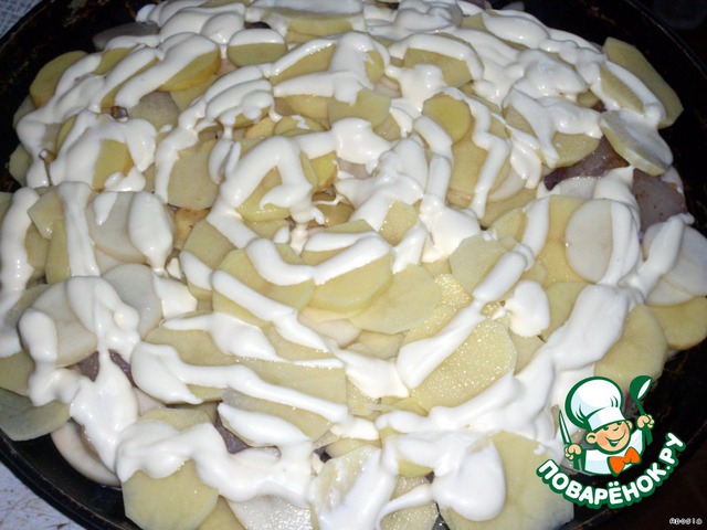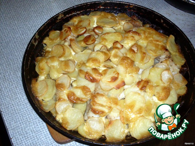 На смазанную маслом форму(сковороду)укладываем слой нарезанного картофеля, солим, перчим. На него слой рыбы, по-соленой, по-перченой, сдобреной приправами. На рыбу еще слой картофеля, соответственно по-соленого и по-перченого. Сверху заливаем майонезом и в духовку примерно на 50-60 минут!