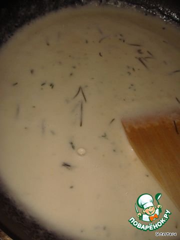 Соус: на сковороду выливаем сливки, доводим почти до кипения и всыпаем пармезан, перемешиваем непрерывно, пока масса слегка не загустеет, добавляем тмин и розмарин.