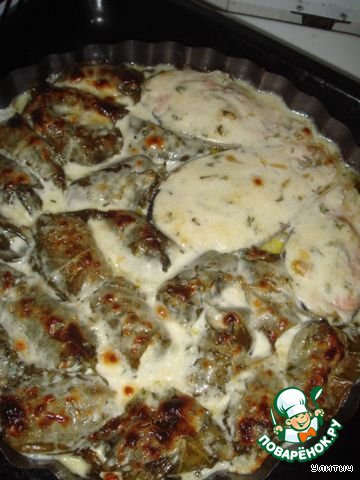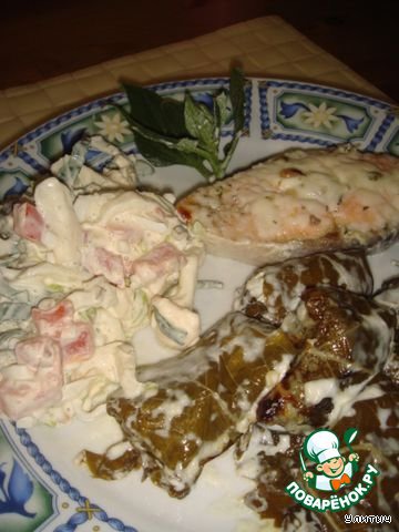 Отдельно хочу поделиться впечатлениями о листиках. Соленые были, муж сказал - пивные. Вкусно, но солоновато. А из свежих получится как раз то, что надо!. Но нет у нас таких. Ну, а вообще, было вкусно! Такое вот блюдо, с достоинством!