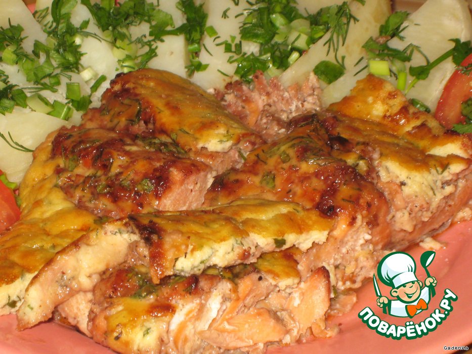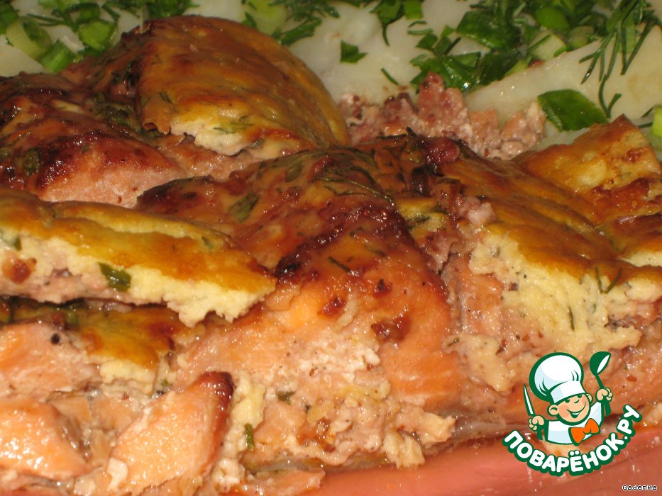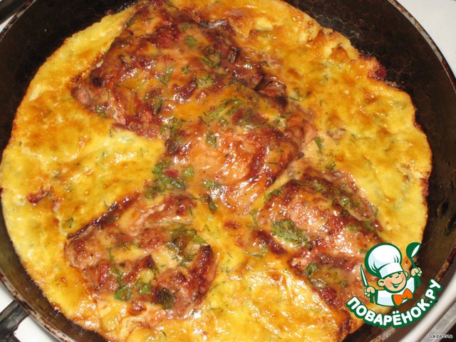 Через 10 минут вытаскиваем нашу рыбку, заливаем и ставим обратно в духовку на 20 минут при 180-200 градусах. Запекаем до румяного цвета суфле.