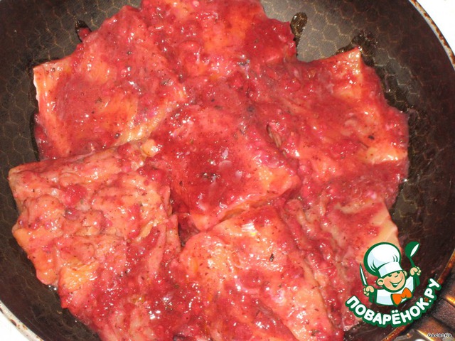 В брусничное пюре добавить все ингредиетны для маринада. Чеснок выдавить через пресс, перемешать все хорошо и залить рыбу на 20-30 минут.