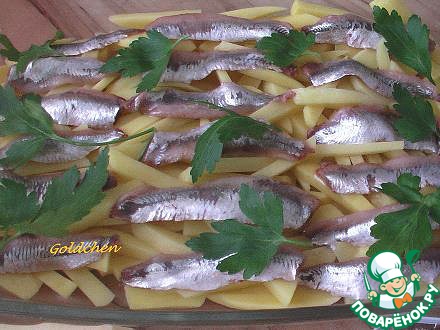 Огнеупорную форму смазываем сливочным маслом. Выкладываем сначала слой картофеля, затем слой лука (лук можно предварительно обжарить, я не обжаривала), слой анчоусов. И так 2 раза.