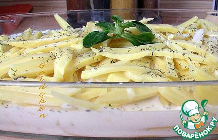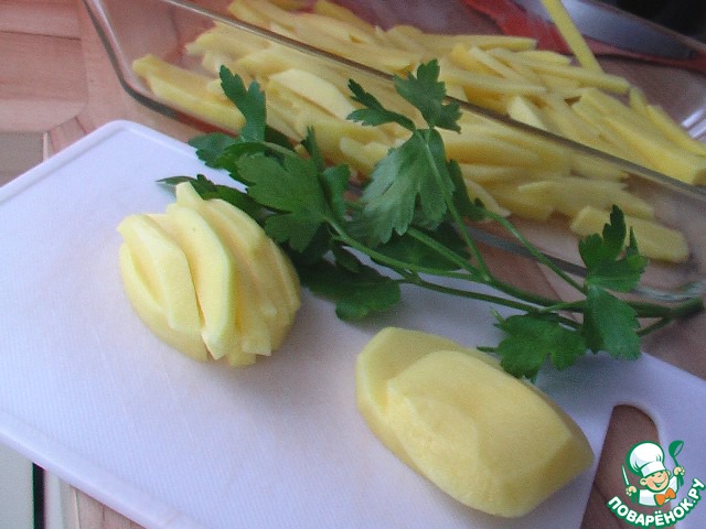 Картофель чистим, моем и режем, как на картошку фри - полосочками. Лук тоже чистим и режeм полукольцами.