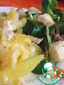 Салат сделала из Feldsalat -"валерьянница". Поджарила с белого хлебa греночки, в соус к салату положила чеснок, бальзамический уксус, оливковое масло, и ещё у меня оставалось со вчера немного копчёного шпика, тоже добавила в салат.