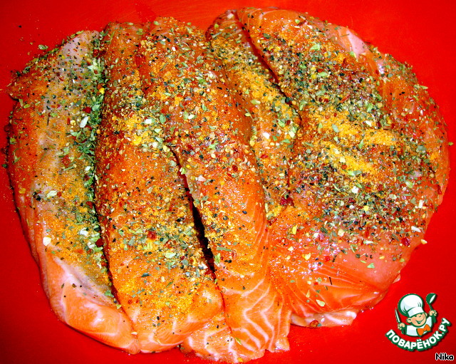 Утром лосось нарезала на порции и замариновала. Использовала средиземноморские травы, смесь перцев, немного сахара и соль. Перемешала и поставила в холодильник до вечера.