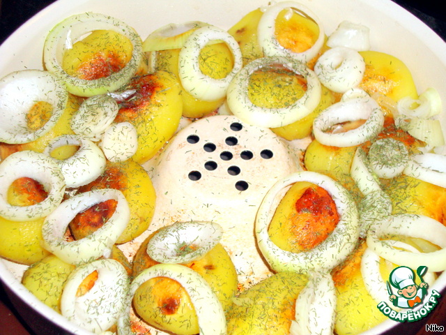 Перевернуть картофель нижней стороной наверх. Разложить кольцами лук и посыпать сушеным укропом. Лук такой для тех, кто любит его пропаренным. Если не едите такой лук, тогда лучше обжарить и посыпать им уже готовое блюдо.