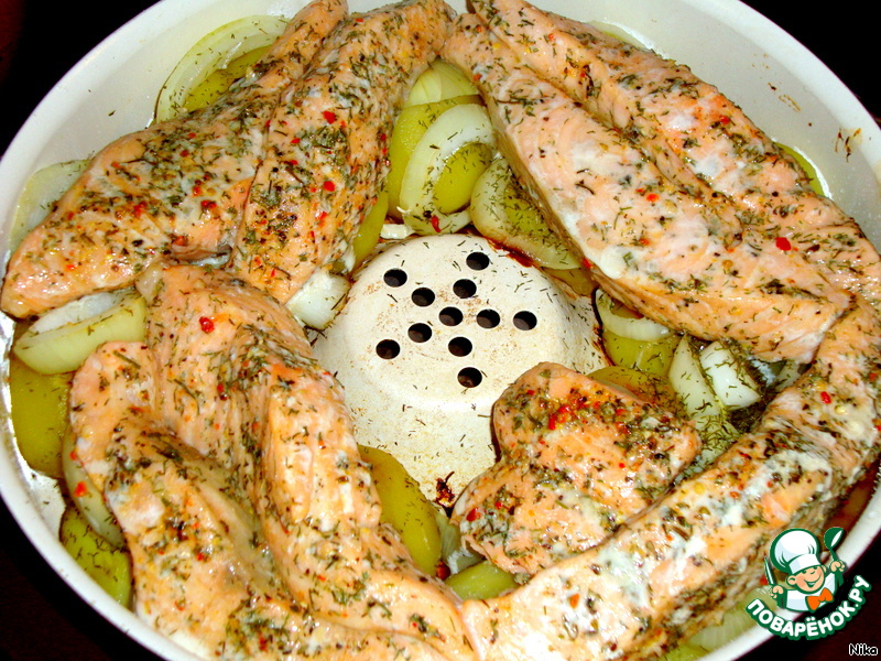 Теперь разложить рыбу на картофель. Солить не надо, соль есть в рыбе.