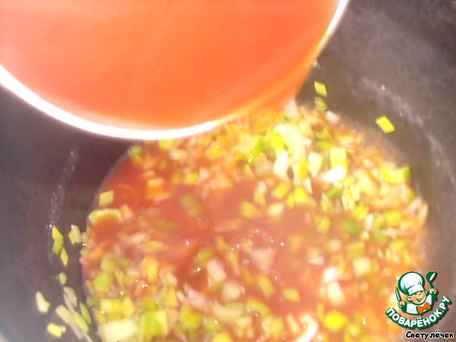 Готовим соус: смешиваем полстакана воды с томатной пастой или кетчупом, добавляем рисовый уксус, сахар, соль. Добиваемся кисло-сладкого вкуса. Лук порей, чили и имбирь мелко режем, а затем в сотейник наливаем 1-2 ч.л. растительного масла и быстро обжариваем. Добавляем соус. При закипании вливаем струйкой крахмал, разведенный холодной водой (1:1), готовим до загустения, помешивая, добавляем кунжутное масло, снимаем с огня.