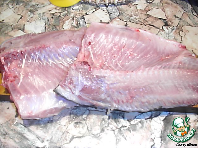Возьмем карпа и очистим от чешуи, удалим внутренности, голову отрежем и отложим. Разделываем на филе, удалив хребтовую кость, но так, чтобы оба филе держались на хвосте. Перевернуть рыбу кожей вниз и удалить все кости.
