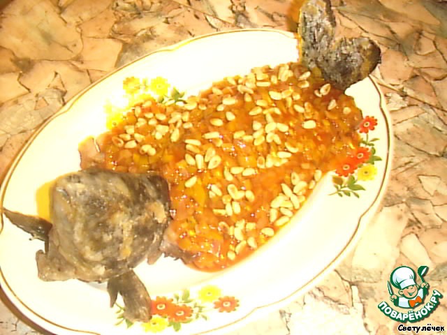В блюдо наливаем немного соуса, выкладываем рыбу кожей вниз, по краям приложить голову и хвост, поливаем соусом, посыпаем орешками, чили (можно ещё зелёным горошком). Подавать сразу же. Приятного аппетита!!!
