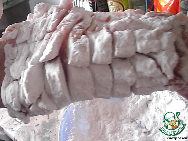 Сделаем надрезы поперек филе под косым углом к поверхности стола, не повредив кожи. Затем сделаем надрезы вдоль филе, но держа нож перпендикулярно столу. Приподнимем рыбу за хвост и, вывернув ее кожей внутрь, потрясем, чтобы надрезанные части мяса отошли от кожи. Обваляем рыбу и ее голову в крахмале.