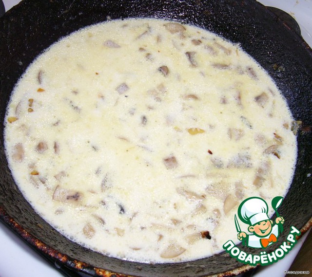 Когда грибы будут наполовину готовы, заливаем в сковороду сливки и томим нашу смесь на медленном огне.
