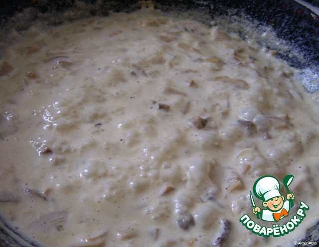 Сливки должны немного выпариться и загустеть. Немного солим наш будущий соус.