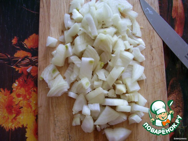 Готовим соус. Для этого режем лук некрупными кусочками и отправляем в глубокую сковороду с разогретым маслом, томим. Лук не должен зажарится, а стать прозрачным.