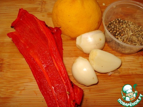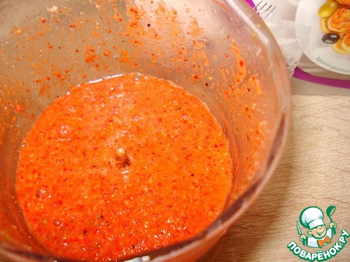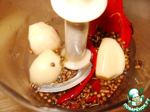 В чащу блендера кладем перчик, зиру, кориандр, чеснок, добавляем сок половинки лимона, воду.