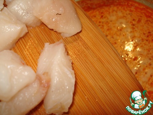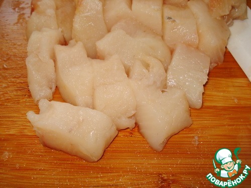 Пока лук на сковороде нарежим рыбное филе кубиками.
