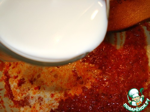 Добавляем к луку чили-пасту и жарим, помешивая, 1 минуту.