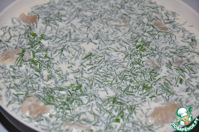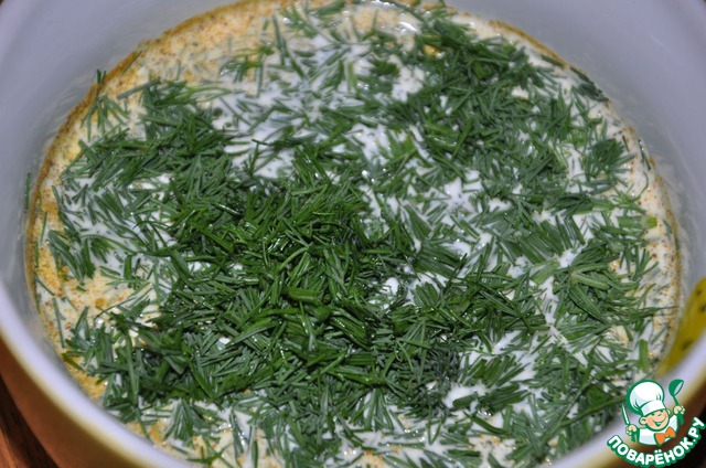 В миске смешать сливки, измельченный укроп, соль, перец, крахмал (или муку) и карри. Перемешать.