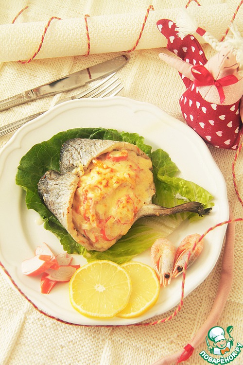 Рыбу достать из духовки, наполнить сливочной начинкой, присыпать сыром и отправить под гриль (200гр.) на 5 минут.