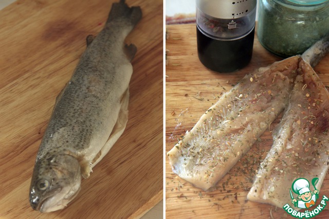 Для приготовления этого солнечного блюда нам понадобится речная форель (свежая или размороженная). Очищаем ее от головы, плавников, разрезаем вдоль хребта и убираем все кости. Добавляем специи для рыбы и соль.