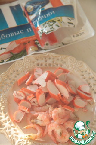 Дня начинки нам понадобятся креветки отварные и крабовые палочки Аморе, которые мы нарежем крупными дольками.