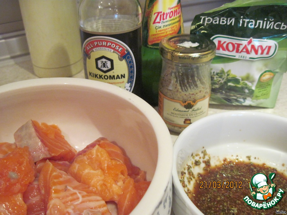 Смешать лимонный сок, соевый соус, горчицу и смесь итальянских трав и замариновать рыбу в полученной смеси. Если есть время, пусть рыба проведет в холодильнике в маринаде несколько часов, если времени нет, то и 30 мин. хватит.