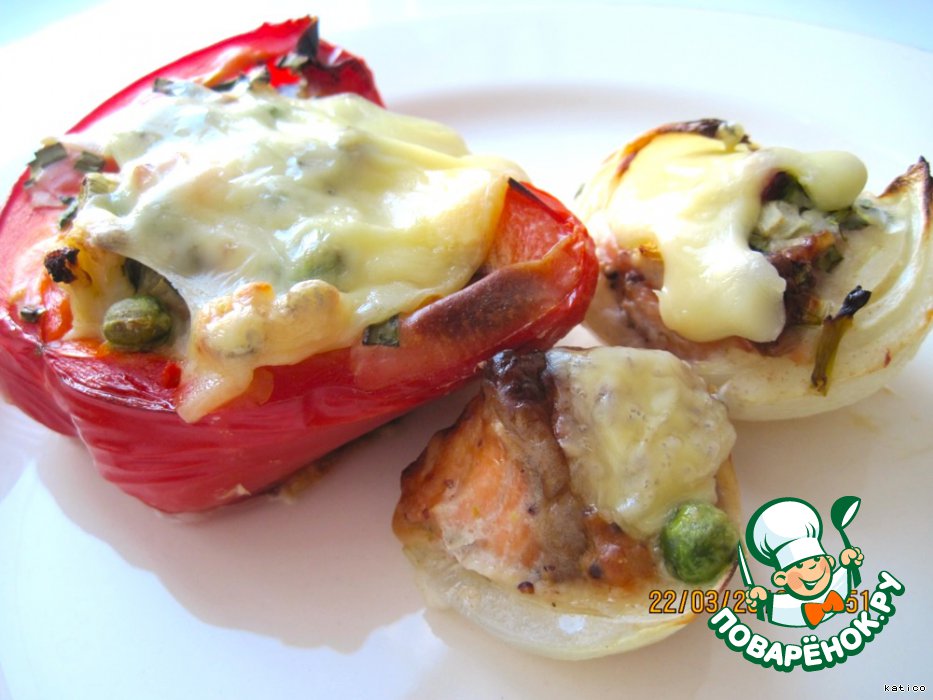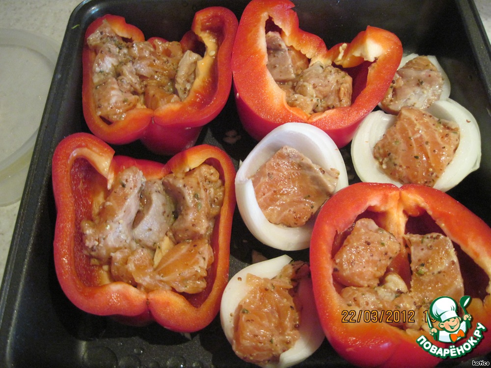 В серединку перцев и луковиц положить по несколько кусочков рыбы (куда сколько влезет), заполняя овощи на 3/4.
