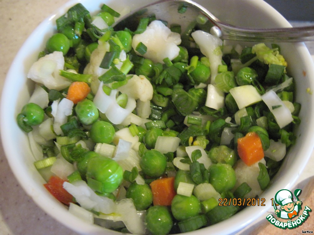 Зеленый лук мелко порезать, оставшуюся серединку лука тоже, добавляем зеленый горошек (размораживать необязательно). У меня еще была капля цветной капусты и помидоров, в очень незначительном количестве, поэтому в ингредиентах не писала, их нужно было пристроить, и они пошли в дело:-) Овощную смесь присолить.