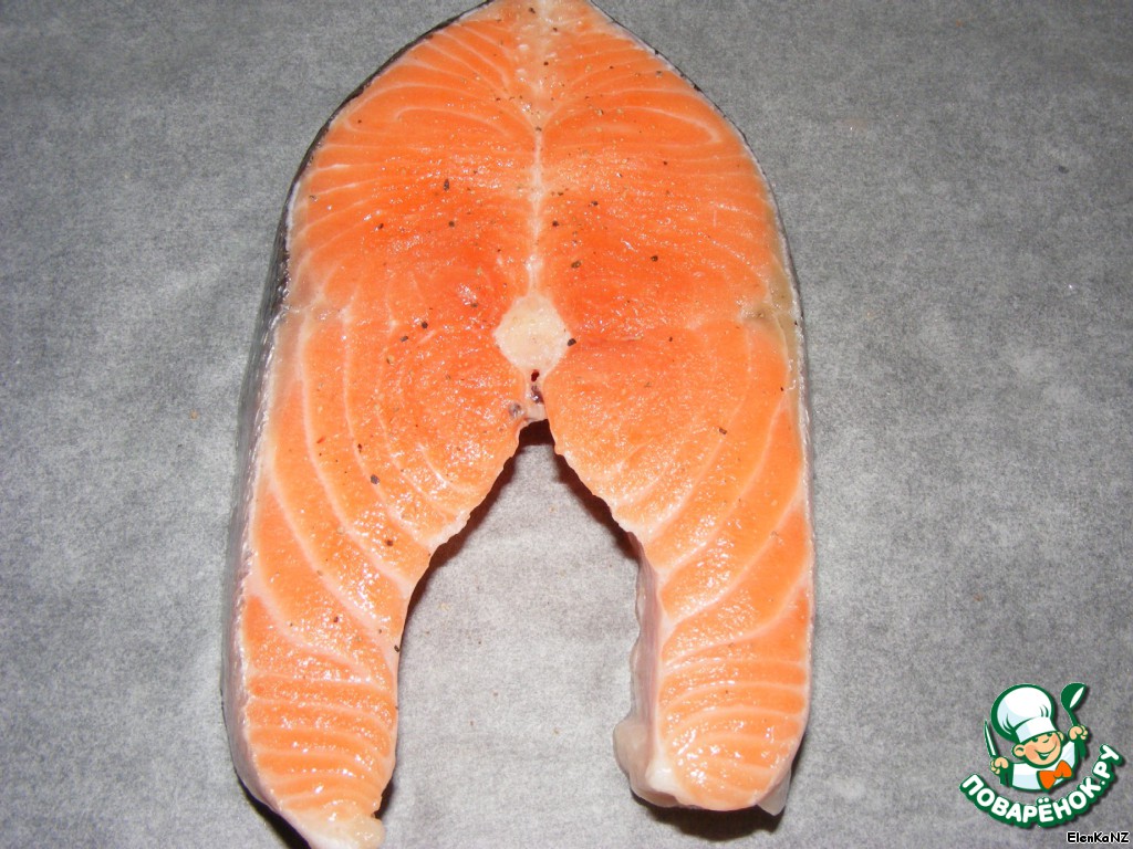 Берем пергаментную бумагу, можно использовать и фольгу. Кладем на пергамент кусочек семги, солим, перчим.
