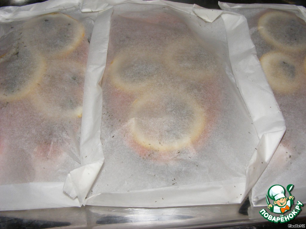Плотно заворачиваем семгу в пергамент и кладем на противень. Запекаем в духовке, предварительно нагретой до 180-200*, в течение 12-15 минут.