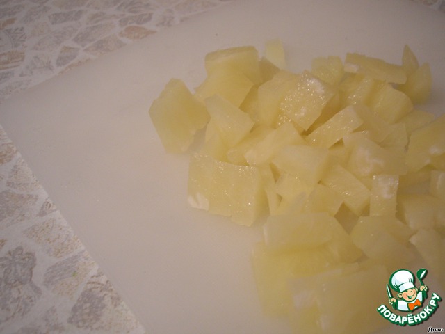 - С ананасов в чашку слить жидкость и нарезать их кусочками.