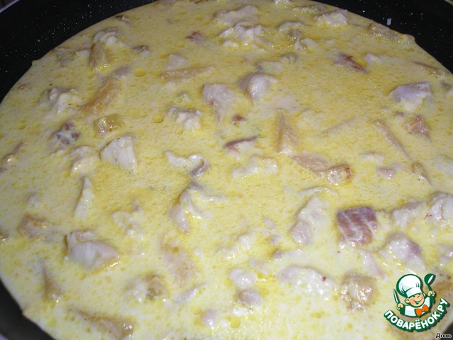 - На разогретой сковороде слегка обжариваем ананасы, добавляем карри и продолжаем обжаривать под крышкой на небольшом огне (если начнет пригорать, можно подлить немного сливок).