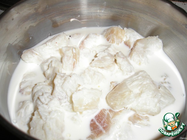 В небольшую кастрюльку выкладываем рыбу и заливаем ее сливками. Довести до кипения.