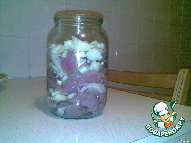 В банку выкладываем слоями: лук, рыба и т. д.