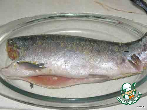 Форель натереть специями, посолить, полить лимонным соком. Оставить мариноваться на 2-3 часа.