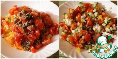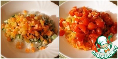 Болгарский перец так же нарезать кубиками, помидоры черри нарезать на четвертинки.