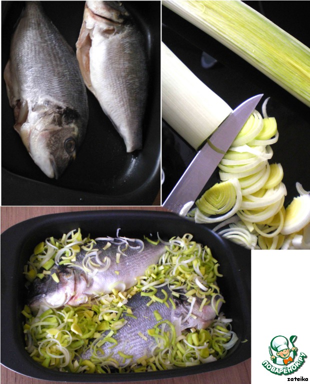 Рыбу потрошим, моем, чистим и выкладываем на чуть смазанный маслом противень или в другую жаропрочную посуду. Лук-порей режем тонкими полукольцами, выкладываем на противень рядом с рыбой.