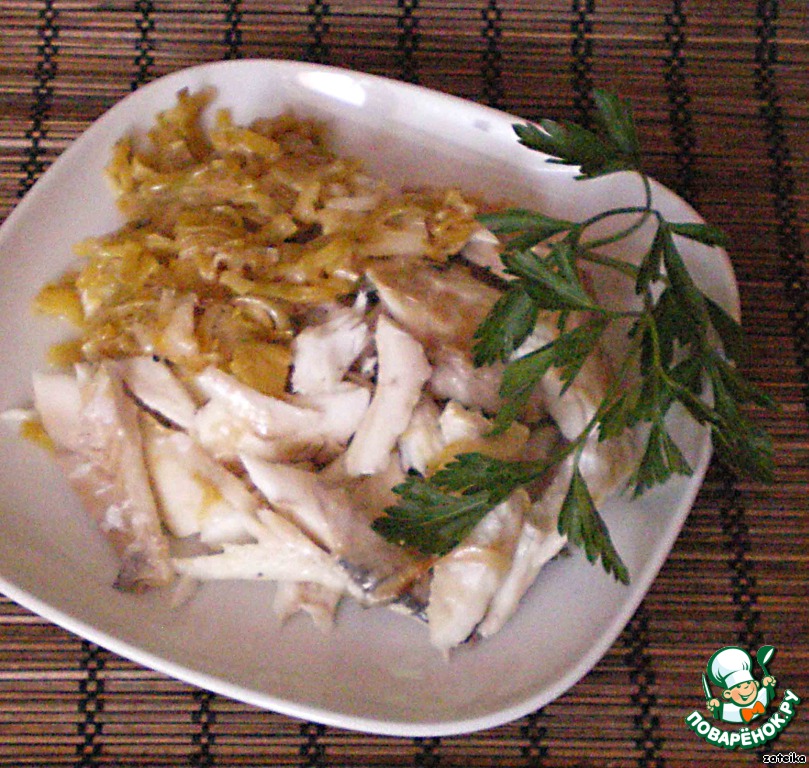 Подать рыбу можно, выложив ее на тарелку и «укрыв» луковым «одеялом»...